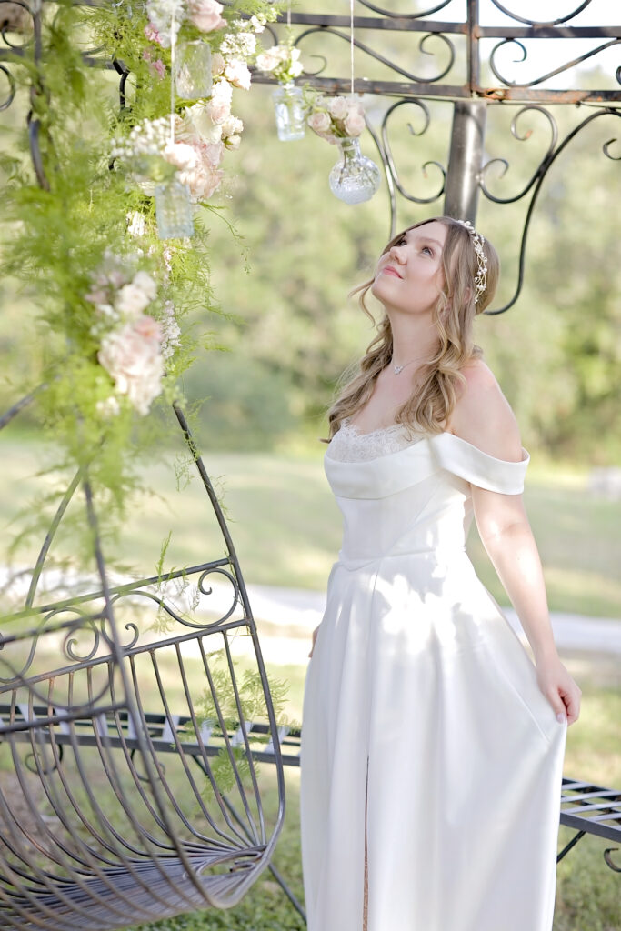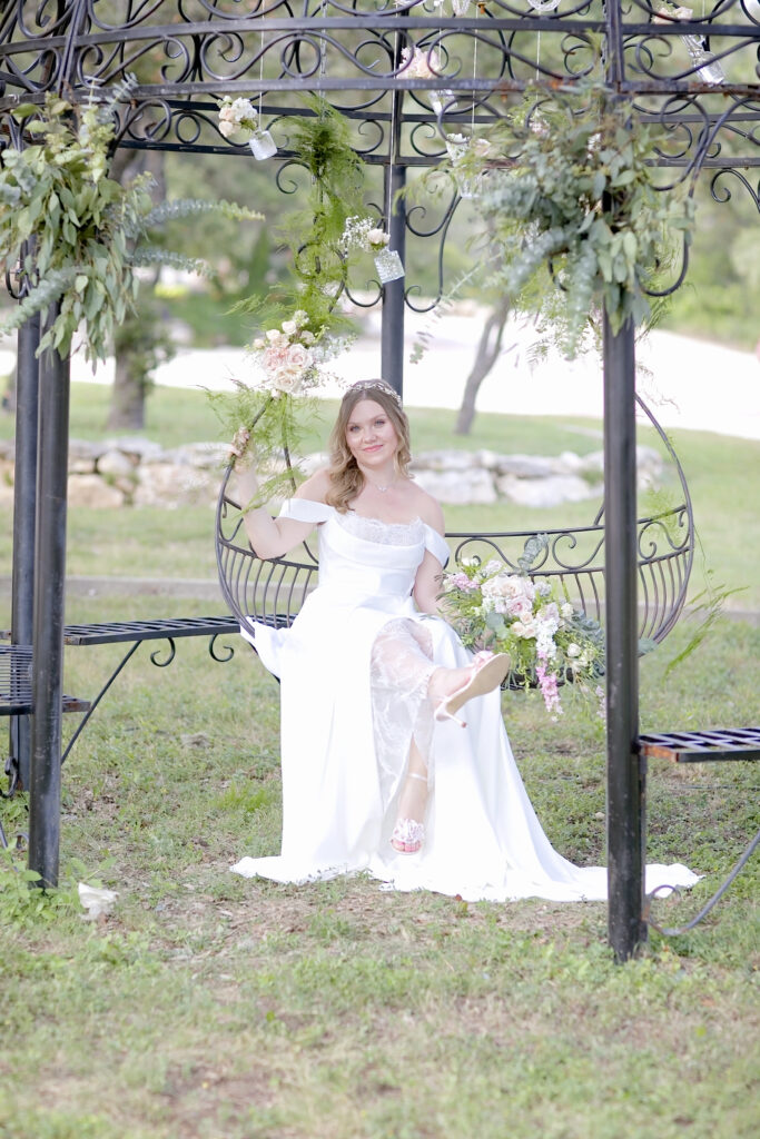 Oaks at Heavenly, located just outside San Antonio in Helotes, Texas, is known for its charming rustic elegance and stunning outdoor spaces. The gazebo and iron swing served as focal points for the styled shoot, offering romantic backdrops perfect for bridal portraits and ceremony inspiration.