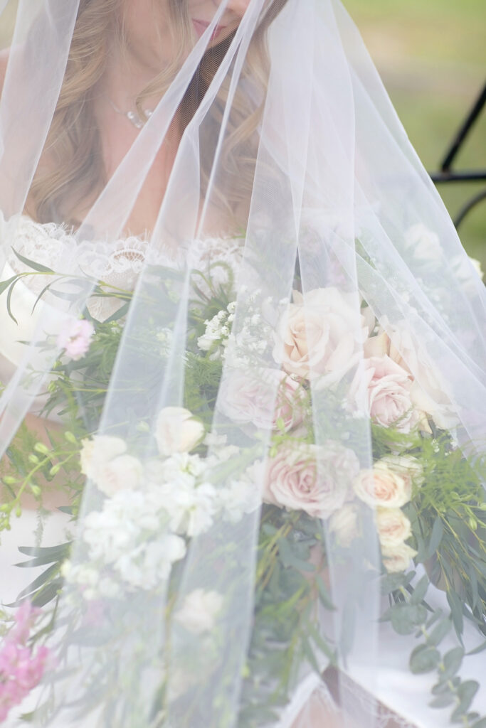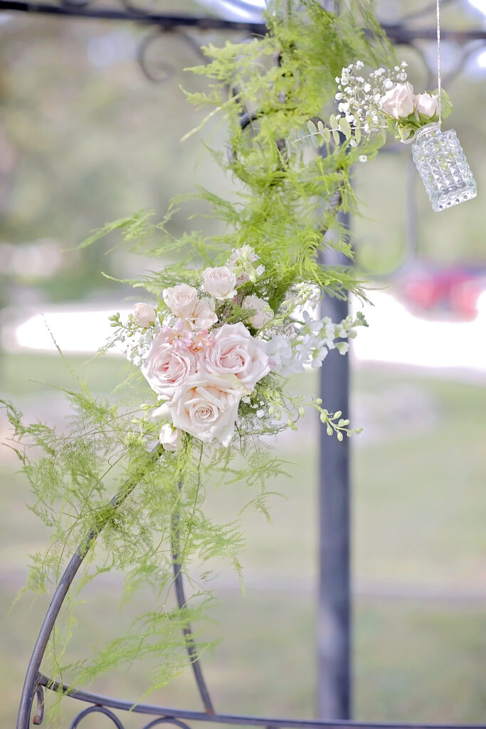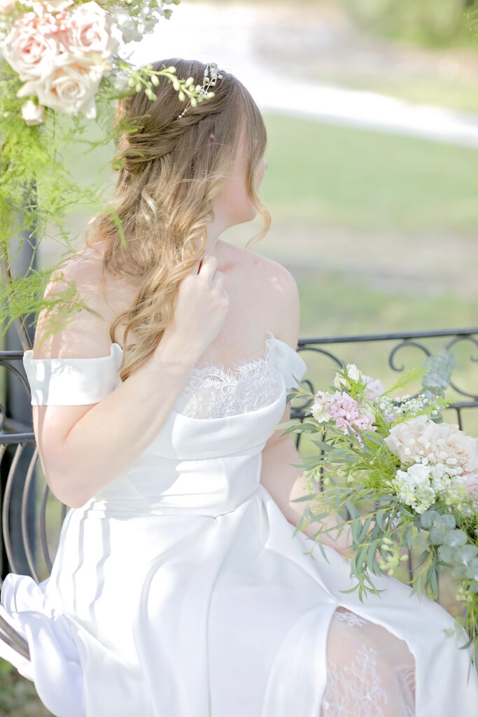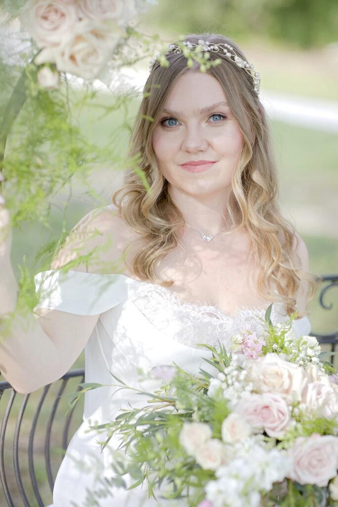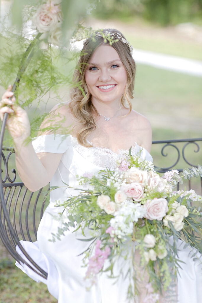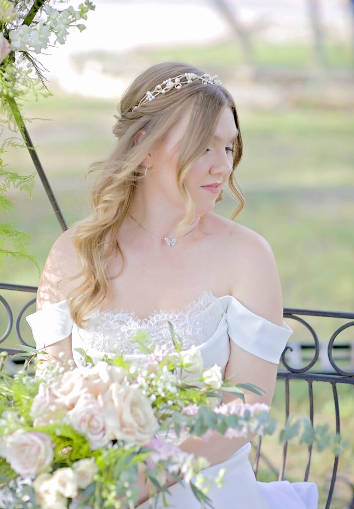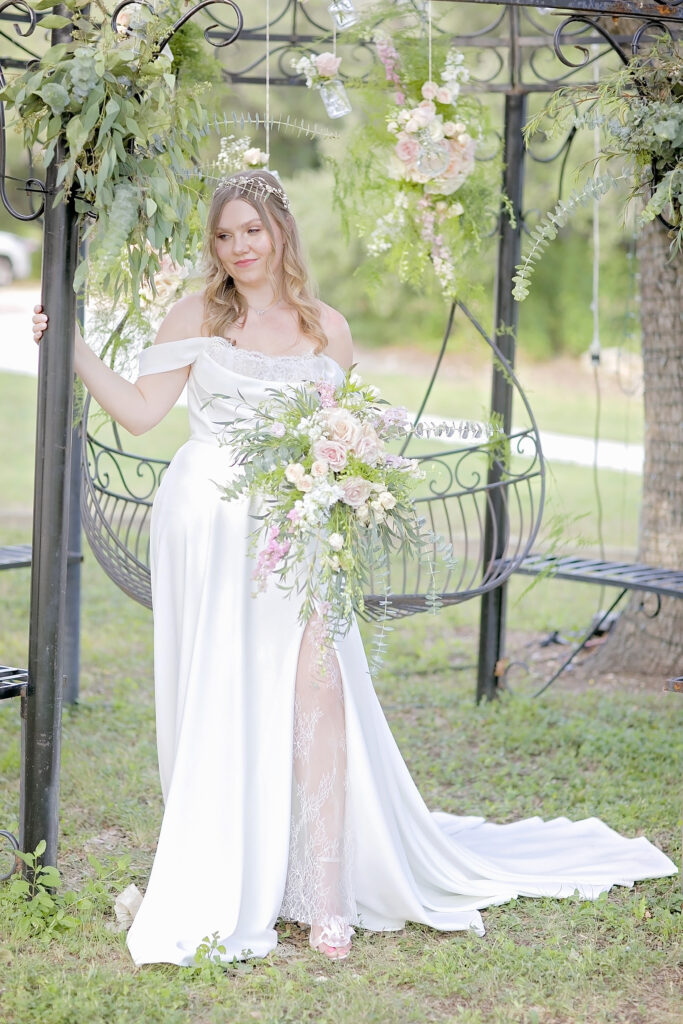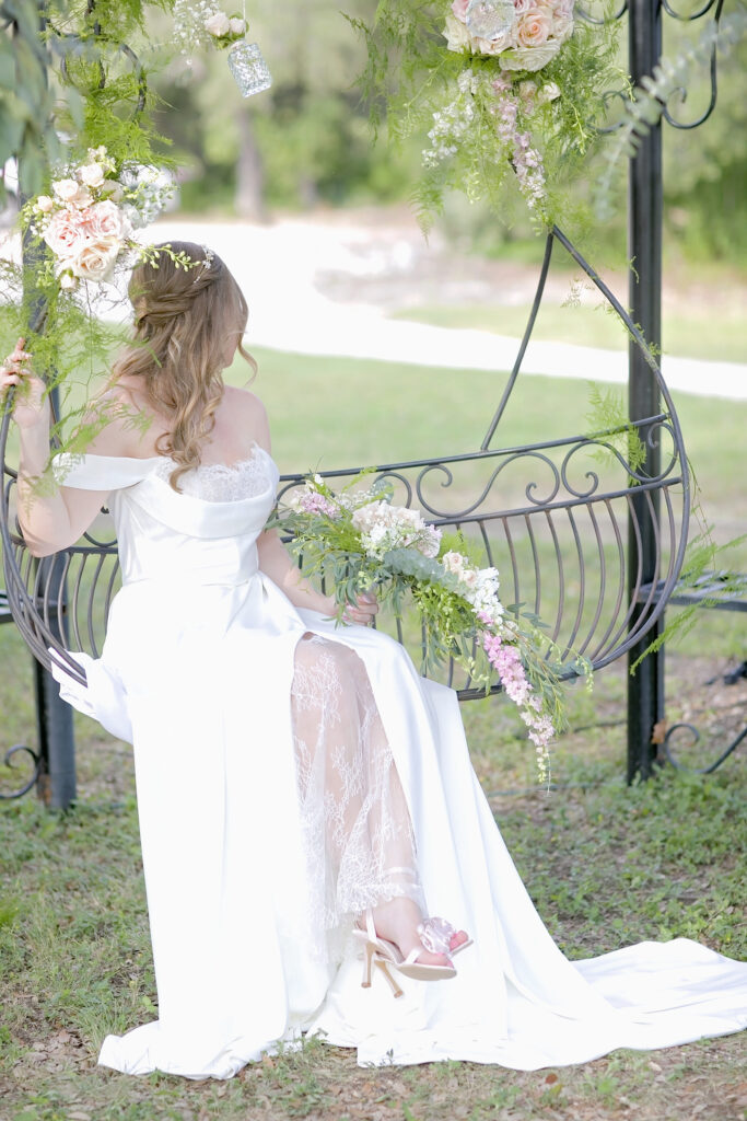 This romantic styled wedding shoot at Oaks at Heavenly in Helotes, Texas captures timeless elegance with soft, sophisticated details. Featuring a white and pink color palette with hints of beige, the shoot highlights the beauty of the venue’s gazebo and iconic iron swing at the entrance, creating a picturesque setting for intimate wedding moments. Model Lauren brought the vision to life with grace and elegance, perfectly showcasing the bridal looks and floral designs.