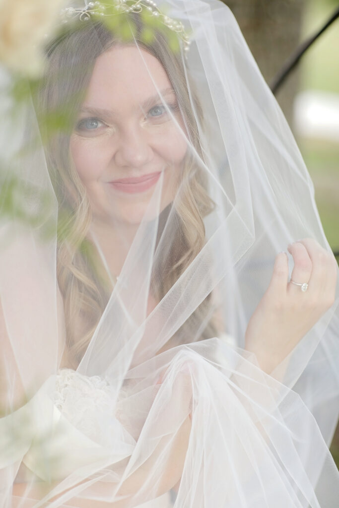 The bride’s dress was provided by Brides by Elizabeth, featuring a romantic silhouette perfect for the garden-inspired venue. Another featured gown by Moonlight Bridal added elegance and movement to the portraits. Hair and makeup by Lipstick and Lockes – Ashleigh completed the bridal look with a soft, natural glam that perfectly suited the color palette.
