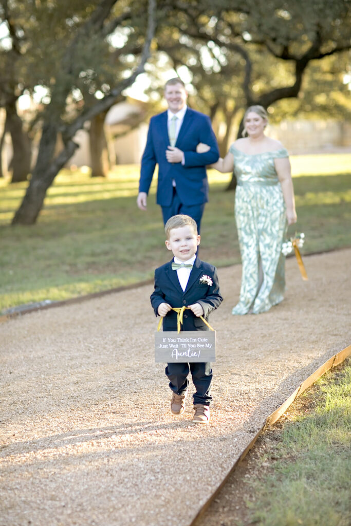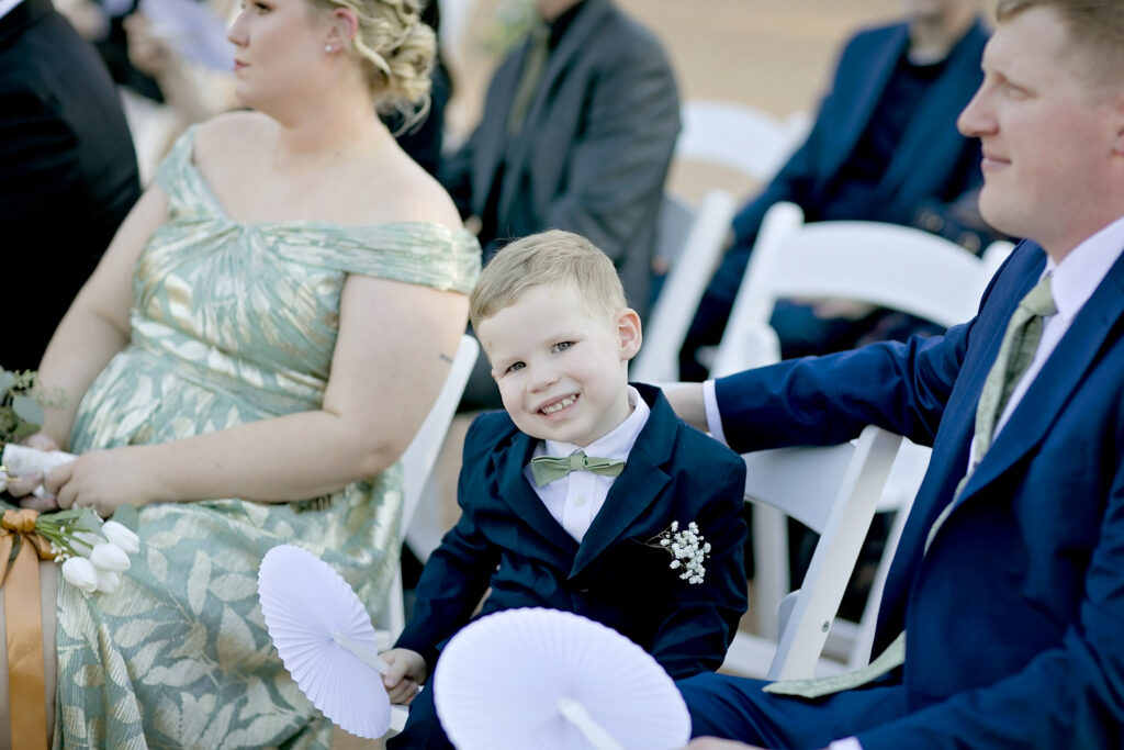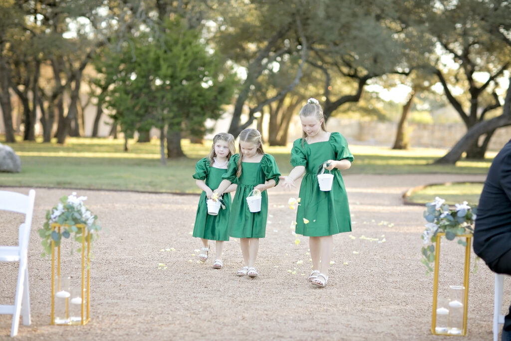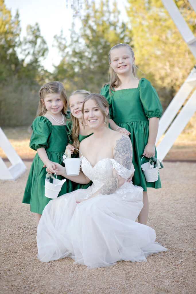 Rather than a traditional wedding party, Rylie and Ron chose to have their closest friends and family dress in deep green to align with the wedding’s color palette. The result felt cohesive and elegant, with a warm vibe. Their adorable nieces served as flower girls in matching green dresses, and their nephew stole hearts as the charming ring bearer — a moment many guests won’t soon forget.